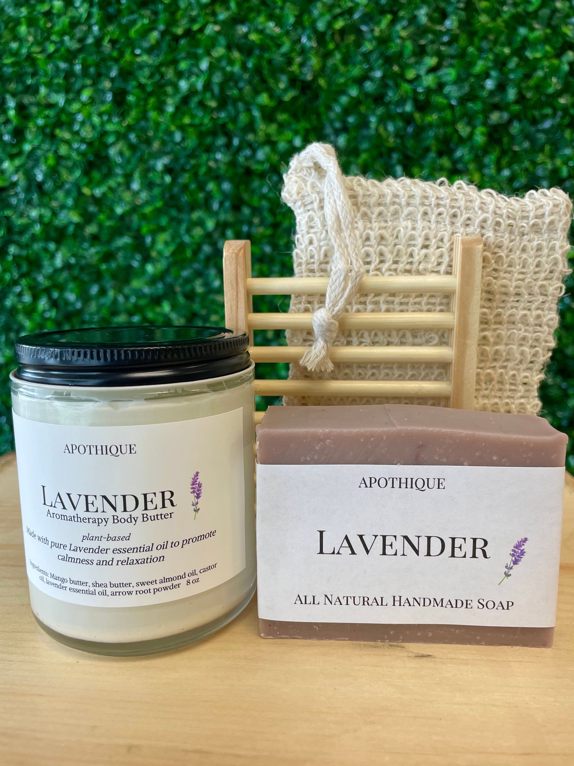 The lavender self care set includes the lavender soap, body butter, bamboo soap tray, and sisal soap pouch. Please see individual products for full description.